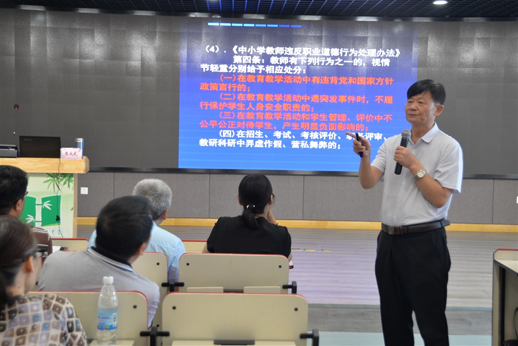 824日上午,张成武教授为翠竹中学及田家炳初级中学全体教师作了“依法执教与师德师风建设专题讲座”。