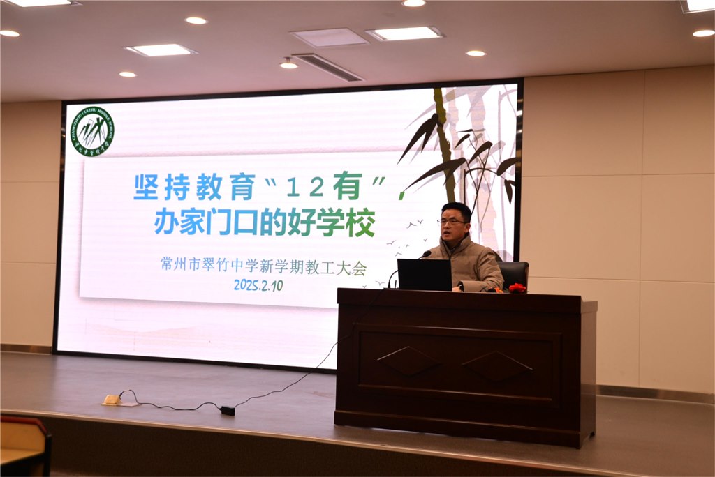 春风轻拂翠竹校园,在这万物复苏之际,常州市翠竹中学迎来了2024-2025学年第二学期的新学期开学工作会议。这不仅是一次工作的部署,更是梦想与希望的起航,全校师生以饱满的热情和昂扬的斗志,共同揭开新学期的序幕。 一、行政布局谋新篇,齐心共绘发展图 ——记行政办公会议 新学期钟声悠扬,翠竹中学行政办公会议率先启航。2月10日上午,各部门中层干部轮番上阵,以精妙的蓝图规划新学期工作路径。 在听取了各部门的汇报后,校领导进行了总体部署。校长陈文伟强调,新学期学校将不断提升教育教学水平,确保学校各项工作稳步推进。同时,他还要求各部门之间要加强协调配合,形成工作合力,共同推动学校事业发展。 二、教研花开映日辉,安全织网护春晖 ——记教工大会 2月10日下午,全体教职工齐聚一堂,召开了新学期教工大会。会上,各教研组长纷纷上台,汇报了教研组建设的亮点及前进方向。他们表示,新学期将继续加强团队建设,深化教学改革,提升教学质量。 章艳副校长就新学期教学工作的变化及方向进行了布置。她指出,学校将进一步加强课程建设,优化教学方法,推动信息技术与学科教学的深度融合,落实“215”政策。 陈庆艳副校长则就学校安全工作进行了详细部署。她强调,安全是学校工作的重中之重,新学期将进一步加强校园安全管理,完善安全制度,提升师生的安全意识。同时,她还要求各部门要切实履行安全责任,确保校园安全稳定。 陈文伟校长在总结发言中,再次强调了坚持教育“12有”,办家门口的好学校。 三、班主任领航新学期,细微之处见真情 ——记班主任工作会议 会议就开学各项工作进行了细致布置,包括学生报到、班级文化建设、安全教育等方面。会议要求班主任们要密切关注学生的身心健康,加强家校沟通,共同促进学生的全面发展。 同时,会议还强调了班主任队伍建设的重要性。学校将进一步加强班主任培训,提升班主任的专业素养和管理能力,为学校的德育工作提供有力保障。