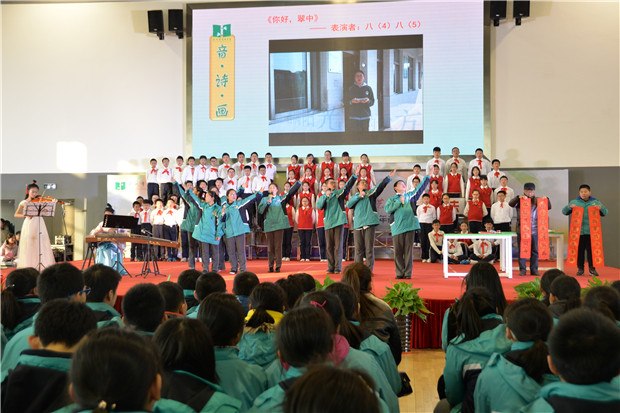 在晚会上,八年级同学的诗音画《你好,翠中》将所有人的记忆拉回到了正在重建的翠中老校园。还是在那樱花树下,还是在小池塘旁,还是那个幽长的连廊,同学们轻声诉说着快乐美好的校园生活,诉说着对学校最深的祝福。