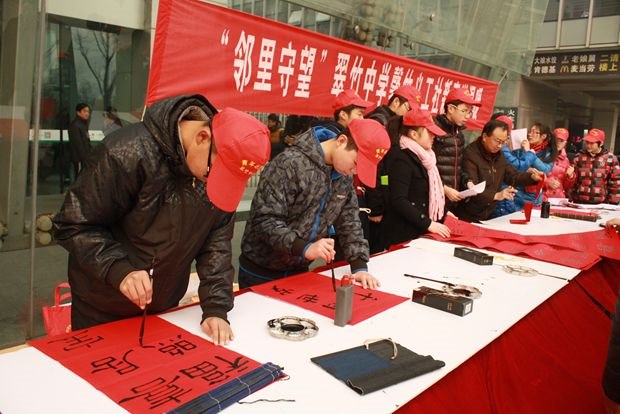 上午10小书法家们工整、简洁,又不失大气的春联作品让人拍手称快。“同学们写的春联不仅字好看,而且很有意义,过大年,贴春联,图个吉利!”手拿春联的老大爷开心地说道,“但是啊,活动的宣传力度不够大,很多人还不知道这个活动呢!”校团委老师表示会积极采纳建议,在下一次活动中改进。“这回不但省了钱,还省了不少事。”拿着大红“福”字的一位老婆婆笑着对我们说,整整一个上午,几位同学忙碌得几乎不得片刻休息,他们热情高涨,龙飞凤舞。一幅幅红彤彤、散发浓浓墨香而又寓意深刻的春联,映红了社区居民的脸庞,现场气氛喜庆。活动的开展,既让社区居民体味到浓浓的春节气氛,也弘扬了我国传统的书法艺术和过节文化。