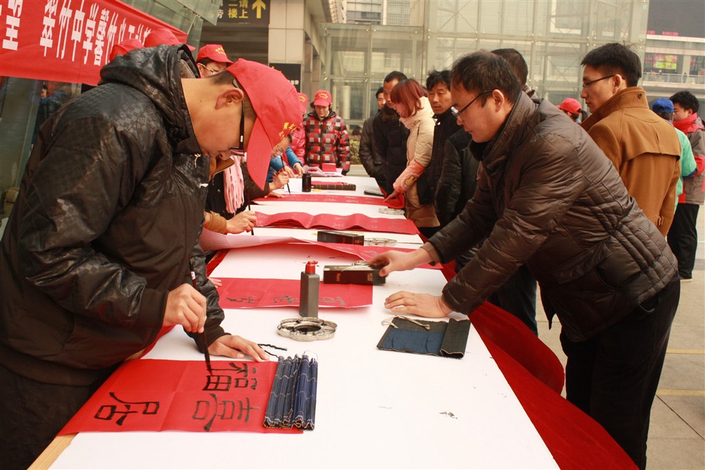 2014125,上午9点刚过,在热闹拥挤的常州火车站北广场,行色匆匆的返乡客们在上火车之前,收到了一份来自常州的祝福。由常州市翠竹中学义工队和“艺景轩社团”主办的“火车站送春联,送常州祝福”写春联、送祝福文化惠民活动走进常州火车站,来自社团的同学及两位老师现场挥毫泼墨,为返乡过年的外来务工人员书写春联,让他们把"常州祝福"带回家。