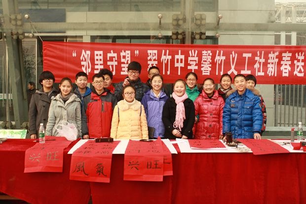 201422上午,常州市翠竹中学校门口人头攒动,年味正浓。几位来自翠竹中学八年级的小书法家冒着严寒,挥毫泼墨,一幅幅洋溢着新年喜气的春联跃然纸上。